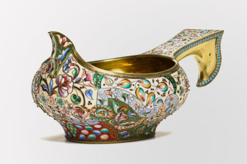 L’orfèvrerie russe au XIXe siècle était influencée par l’esthétique du classicisme et du baroque, ainsi que par la tradition russe de l’art populaire. Les orfèvres russes étaient connus pour leur utilisation de matériaux luxueux tels que l’argent doré, le vermeil et les pierres précieuses. Les pièces d’orfèvrerie étaient souvent décorées de motifs floraux, de paysages et de scènes historiques ou religieuses, ainsi que de portraits de personnalités importantes. L’orfèvrerie russe était très appréciée des élites russes et européennes, et était souvent offerte comme cadeaux diplomatiques ou de mariage. Des orfèvres célèbres tels que Fabergé ont créé des pièces emblématiques, comme les célèbres œufs de Pâques impériaux, qui sont aujourd’hui des objets de collection rares et précieux.